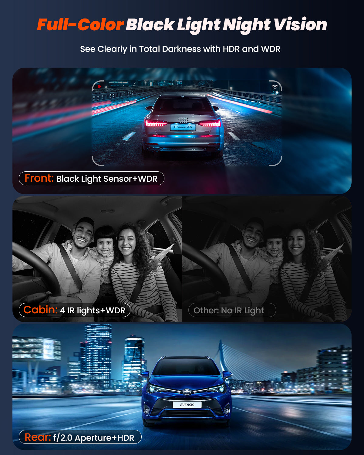[Black Light Night Vision] The J08 front and rear inside dash camera is built for low-light performance. Featuring a large image sensor, 4 IR lights, and advanced WDR technology, it captures ultra-clear footage of license plates, cabin activity, and surrounding vehicles—even in extreme low light condition. Whether you're driving at night, in tunnels, or under dim streetlights, this dash camera for cars never compromises on detail or safety—because protection shouldn't stop when the sun goes down.