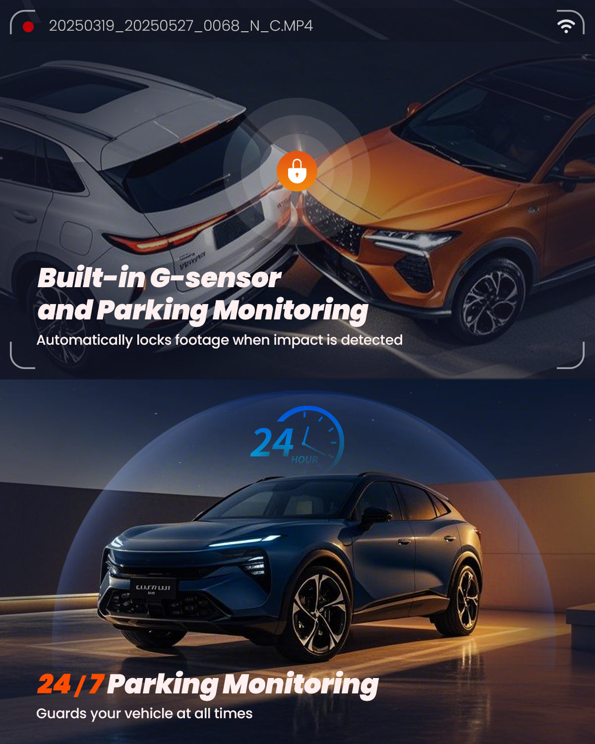 [G-Sensor Collision Detection & Smart Loop Recording] Equipped with a built-in G-sensor, the J08 dash cam for car automatically detects sudden impacts or vibrations and instantly locks the footage before and after a collision—keeping it safe from being overwritten. This ensures you always have critical evidence when disputes arise. With intelligent loop recording, the camera for car continuously records and overwrites the oldest files, so you never miss a moment, even when the memory card is full.